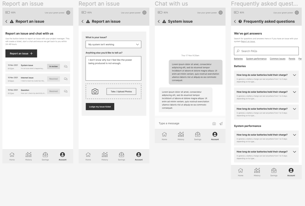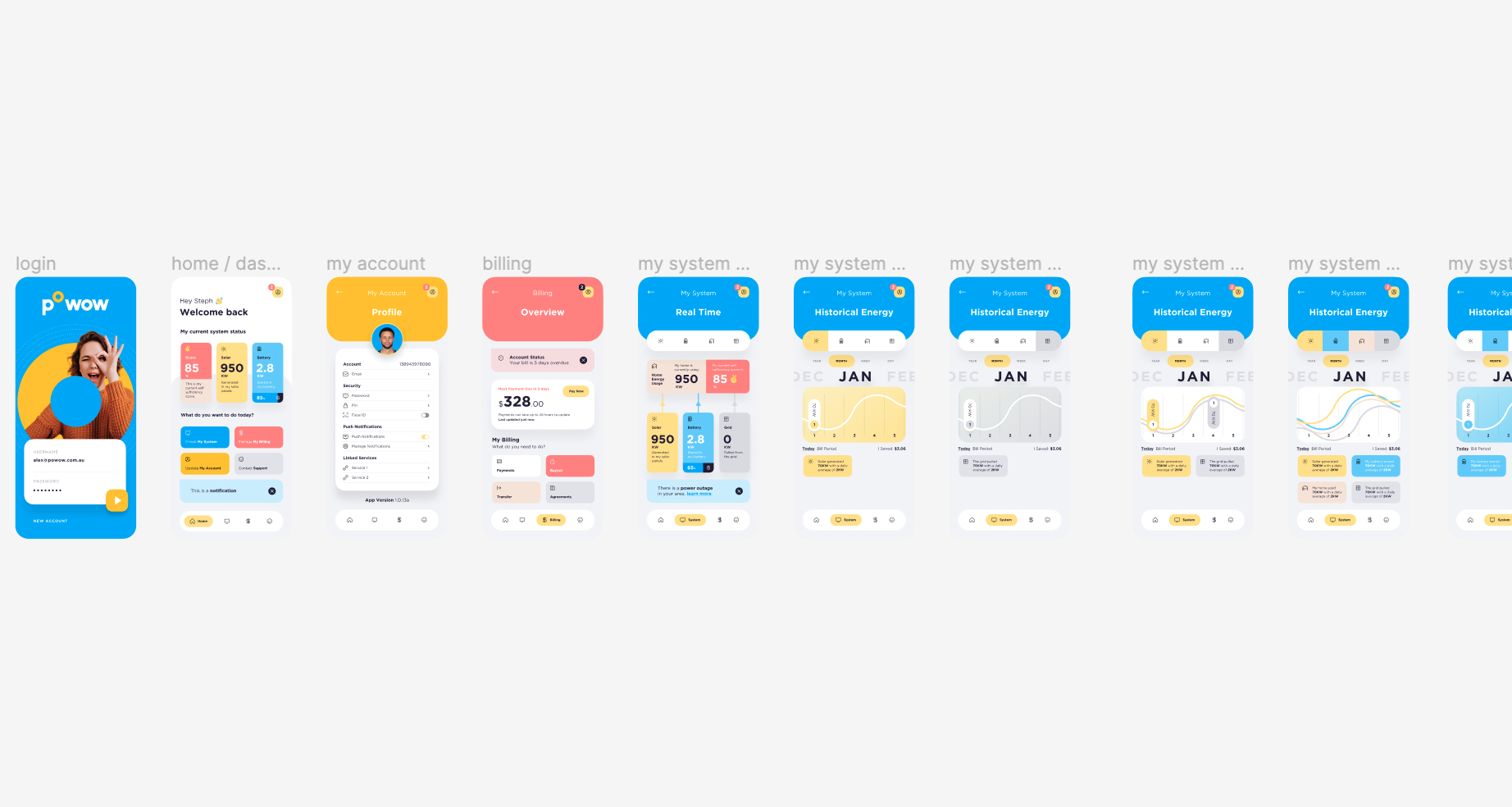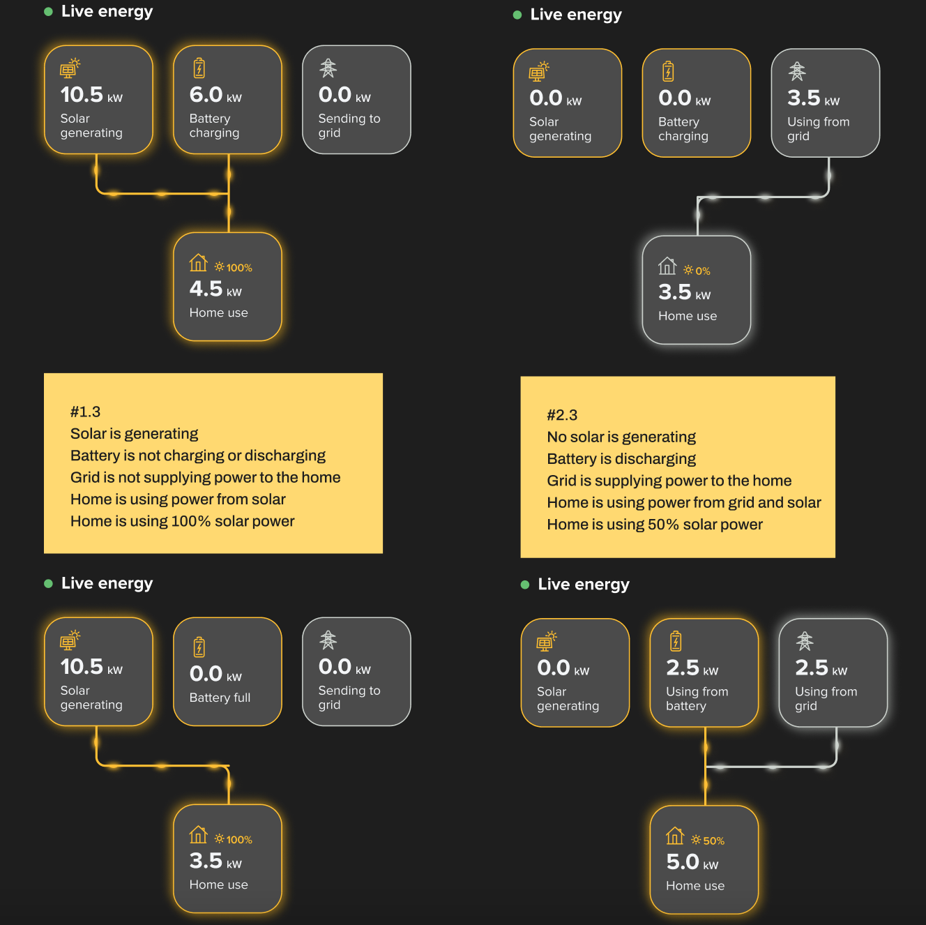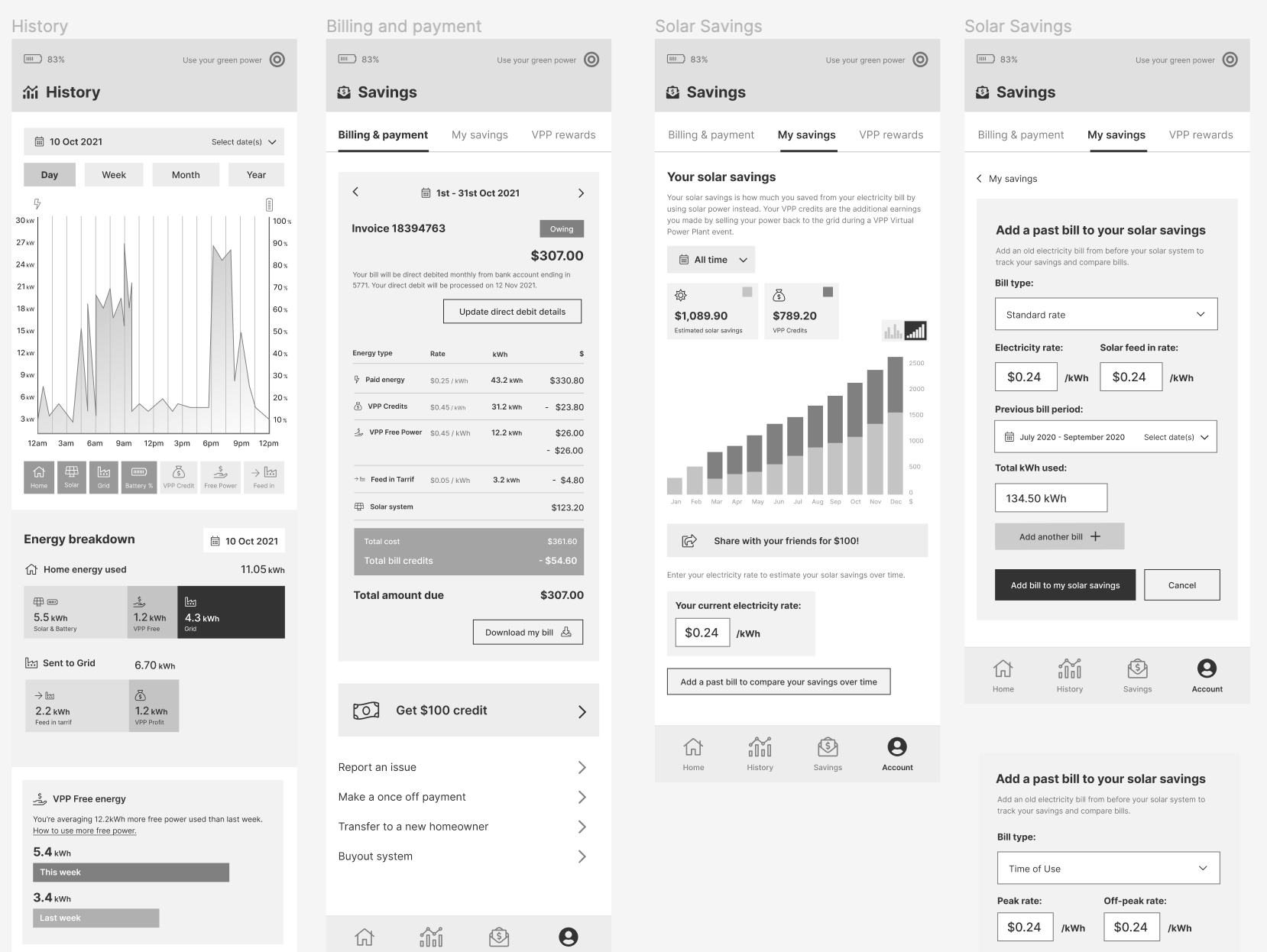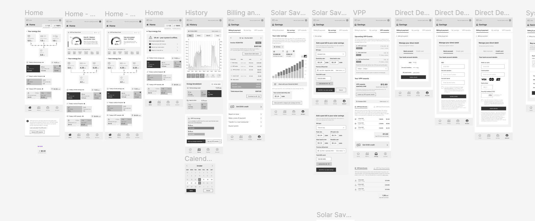The four key elements of power distribution were the solar panels, the battery, their home energy use and the grid. Because there were so many different scenarios around how energy moves through each element, mapping out this process became a vital part of the process and allowed us to see how many moving parts of the app there needed to be.