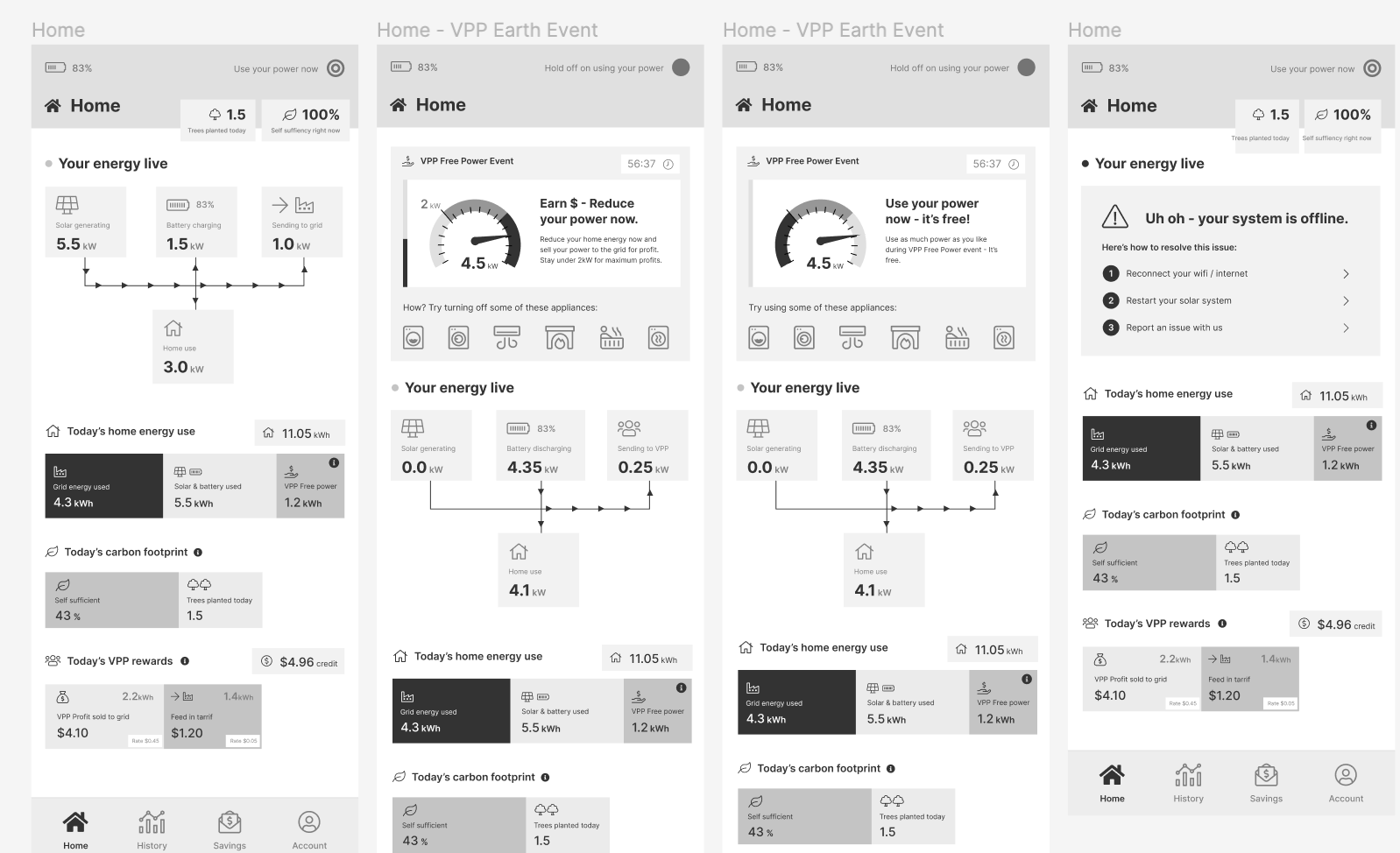Another challenge was communicating to the user on when to use or reduce power in their home to earn money by sending power to the grid during a Virtual Power Plant (VPP) event. After a number of iterations we came up with the below concept whereby a user could see a countdown as well as a pill style bar filling up with the power they were using and easily see when to slow down or stop.